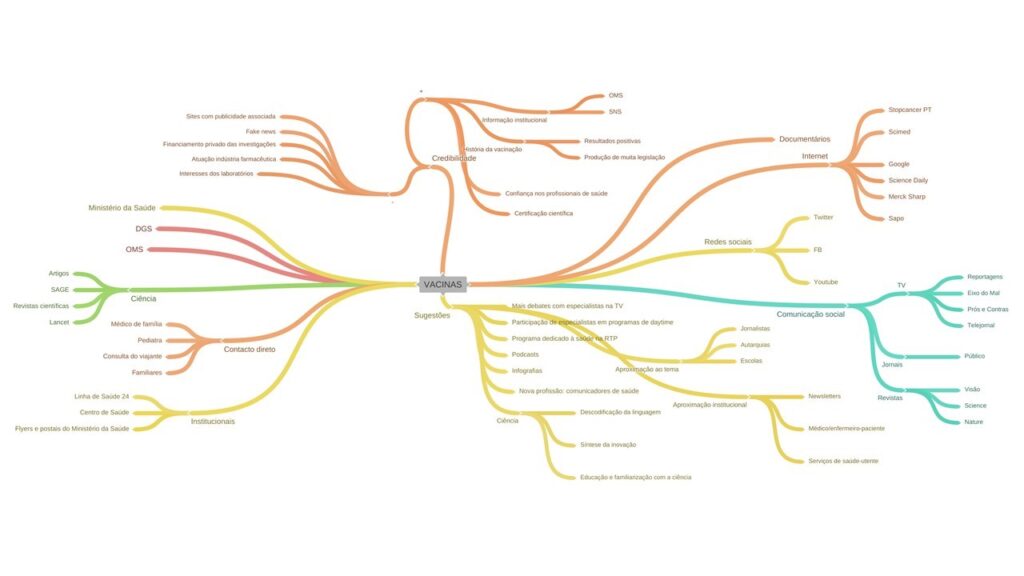 However, these preliminary results need to be understood in the light of the qualitative data (based on content analysis of the transcriptions of the discussions) that national teams are examining now. Before starting coding all the 96 hours of transcriptions, we did an in-depth reading of the text creating some mind maps – some more simple, some more detailed – that helped us define the codebook among all the partners. Some of those simple versions of the mind maps were also used in the conference video as we believed they could give some first hints to our audience. They were structured according to the main questions the facilitators introduced during the discussions, namely how citizens are informed, how reliable the sources are, and what suggestions participants had to improve scientific communication.