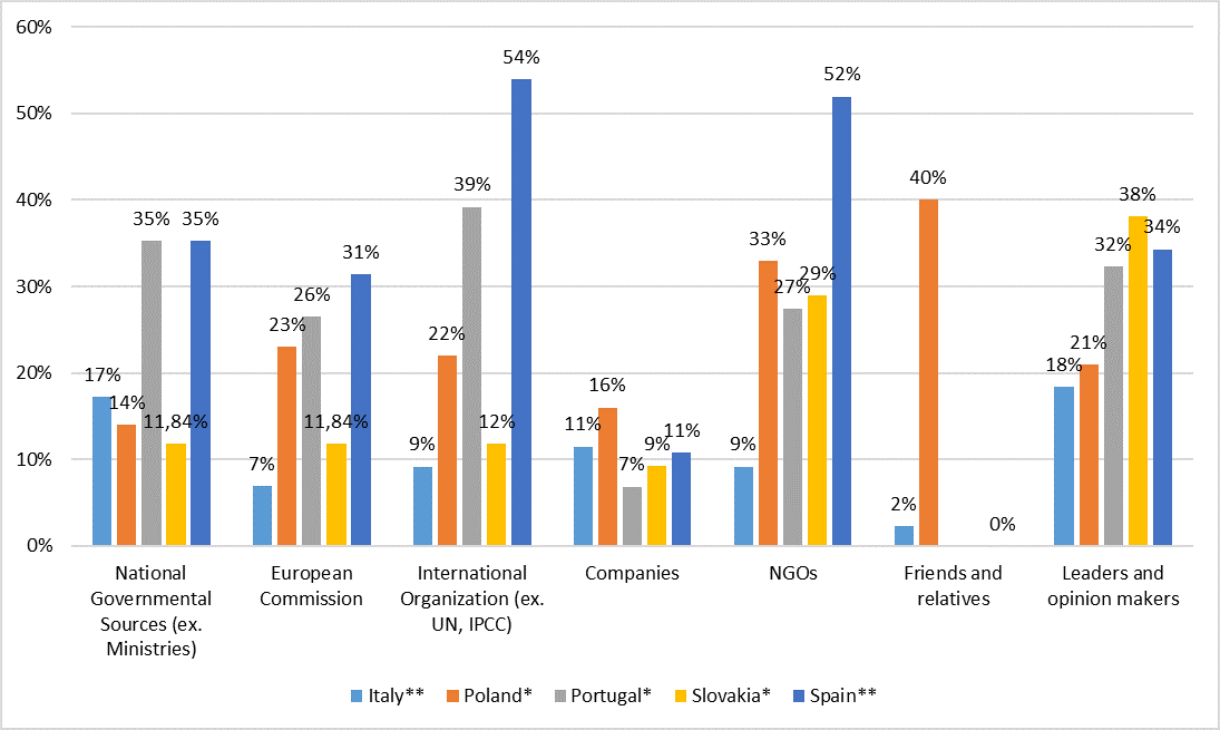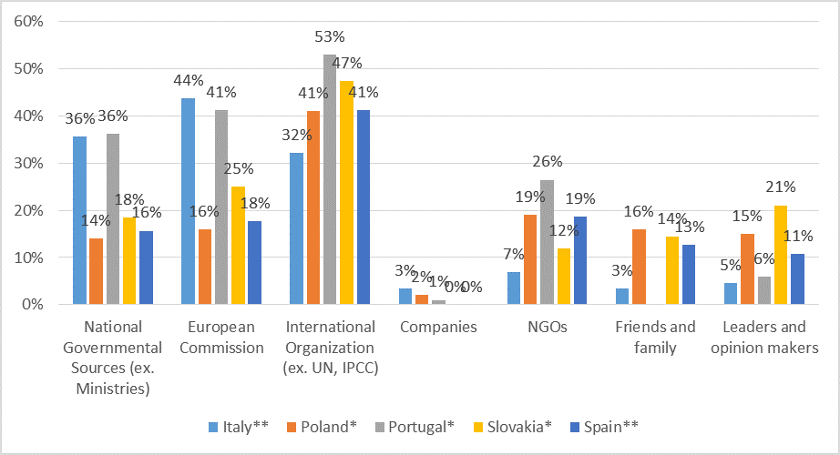 On the credibility of the sources (Figure 2), national governments and the European Commission are more trusted in Italy and Portugal, and international organisations (such as the UN or IPPC) in Spain and Portugal, NGOs in Portugal, friends, and relatives in Poland and leaders and opinion makers in Slovakia. It is remarkable the low level of trust in companies. These results tend to mirror those of previous Eurobarometer surveys on climate and the environment: see, for instance, the 2014 Special Eurobarometer 416.