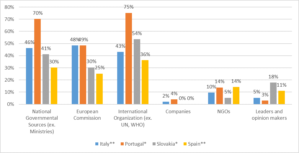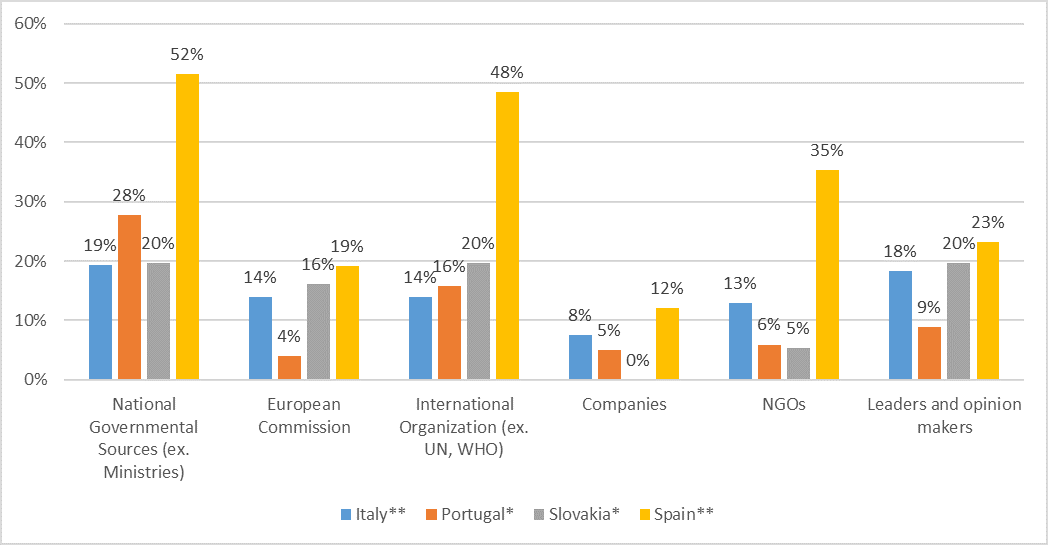 As to health issues, in particular, vaccines (Figure 3), the sources of information from which participants more frequently receive information are national governments (particularly in Spain) and international organisations (also in Spain). NGOs were also favoured by Spanish participants. Once again, companies register very low figures.